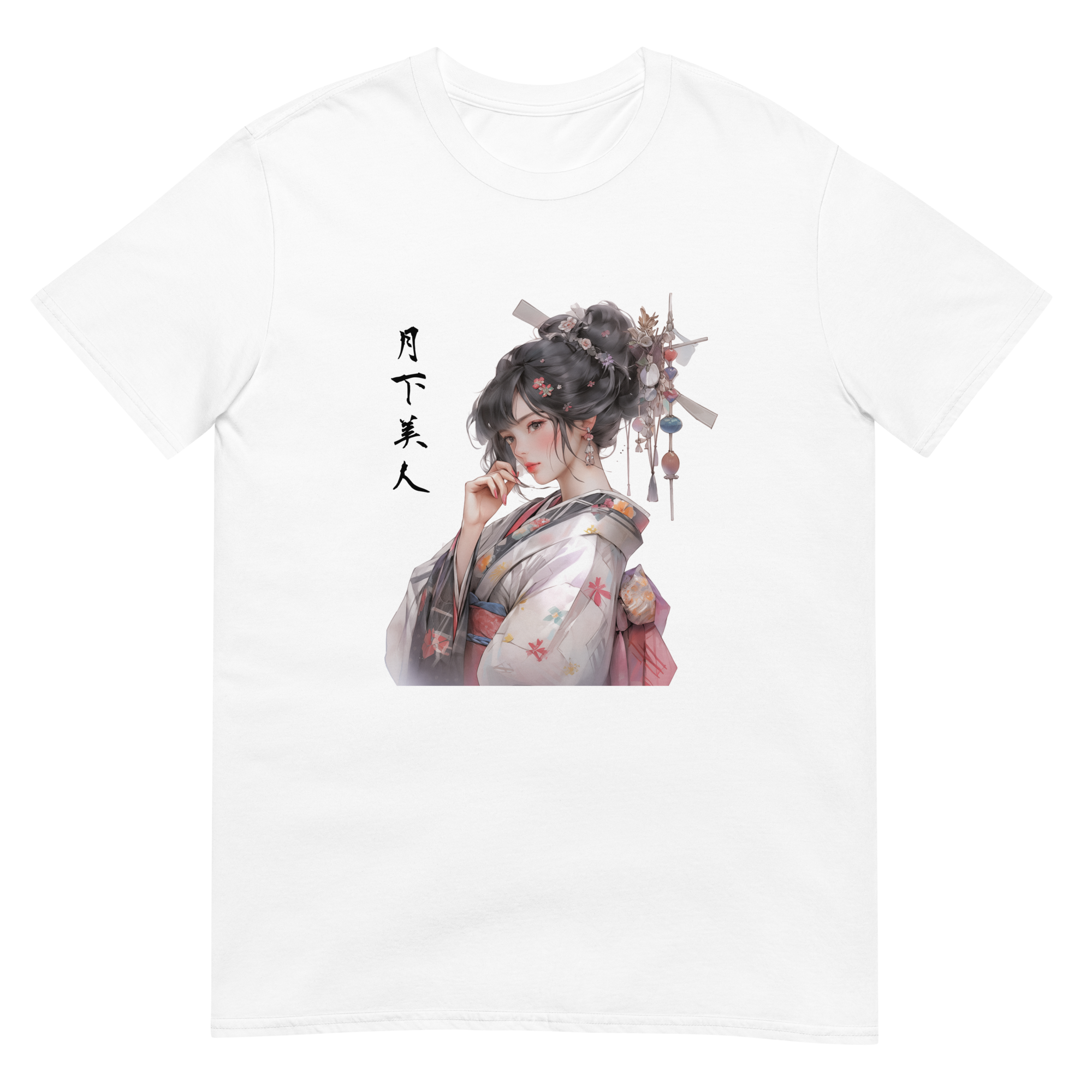 和風アートデザインTシャツ。優雅な着物を纏った女性を描き、日本の伝統美と気品ある世界観を表現した一枚。繊細な模様と色彩が、着る人の雰囲気に上品な印象を与えます。