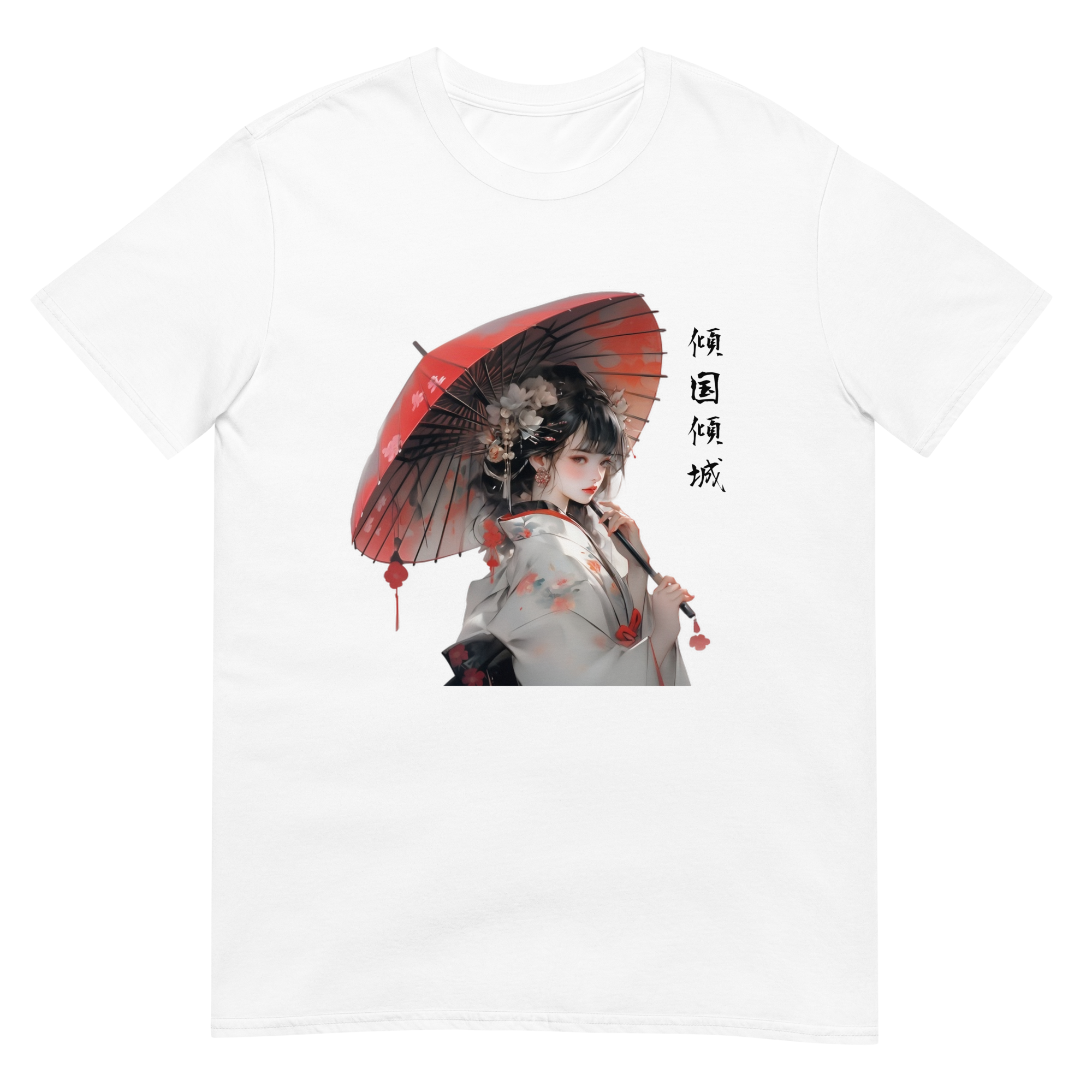 日本の伝統美と圧倒的な存在感を放つ女性を描いたアートTシャツ。艶やかな着物と妖艶な表情は、静かな強さと美しさを象徴し、ファッションとしても高い魅力を持つ一枚です。
