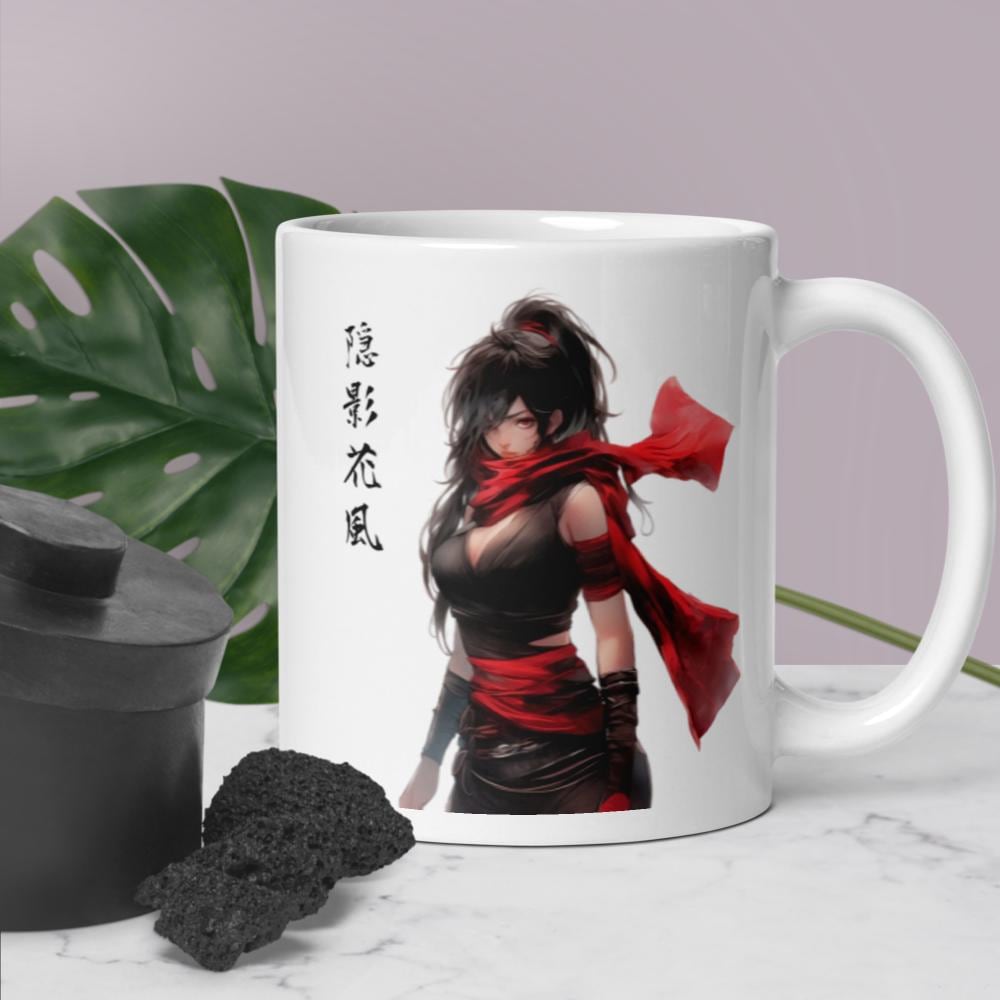 和風デザインのマグカップ。赤いスカーフをなびかせる美しいくノ一を描いた「隠影花風」デザイン。