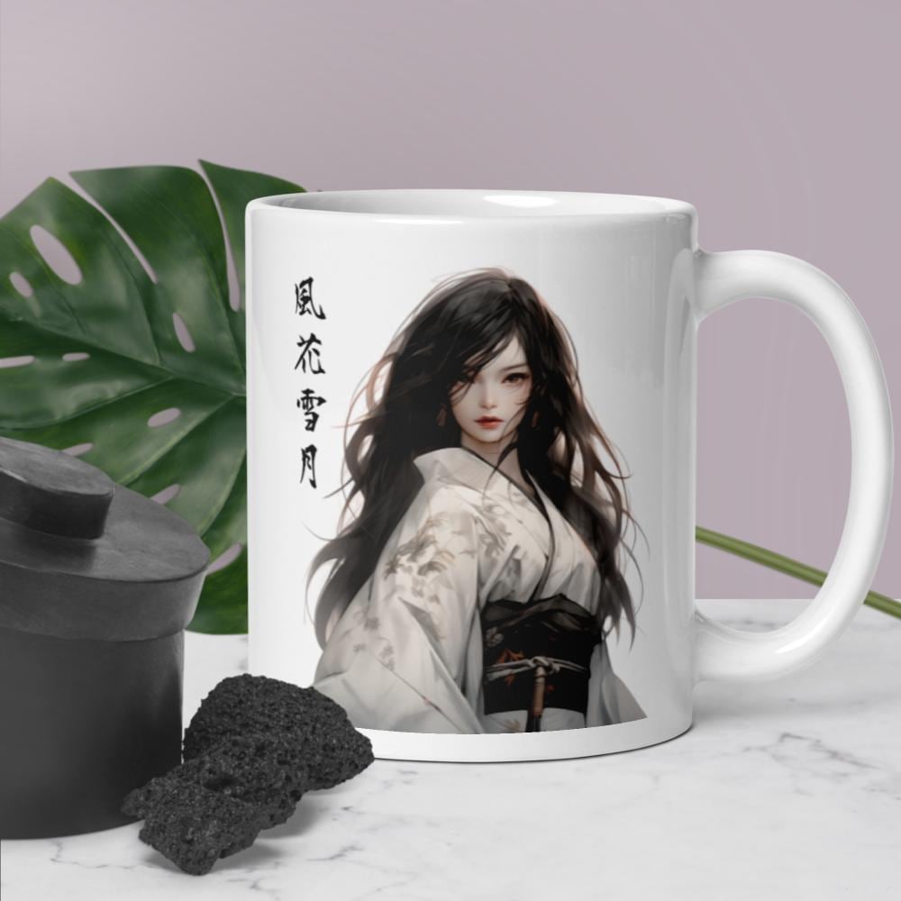 このマグカップは、白い着物を着た黒い長髪の女性をデザインし、「風花雪月」の美しさを表現しています。彼女の清楚で優雅な姿は、日本の四季の美しさと和の精神を体現し、あなたの日常に穏やかな美しさをもたらします。