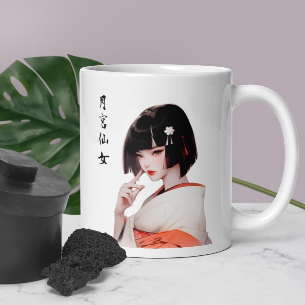 淡い月光を思わせる色合いの着物と繊細なデザインは、日本の自然と神話の美を融合させています。このマグカップを手に取る度に、日本の歴史と文化、そして月の宮殿の仙女の神秘に触れ、心が癒されるひとときを感じることができます。
